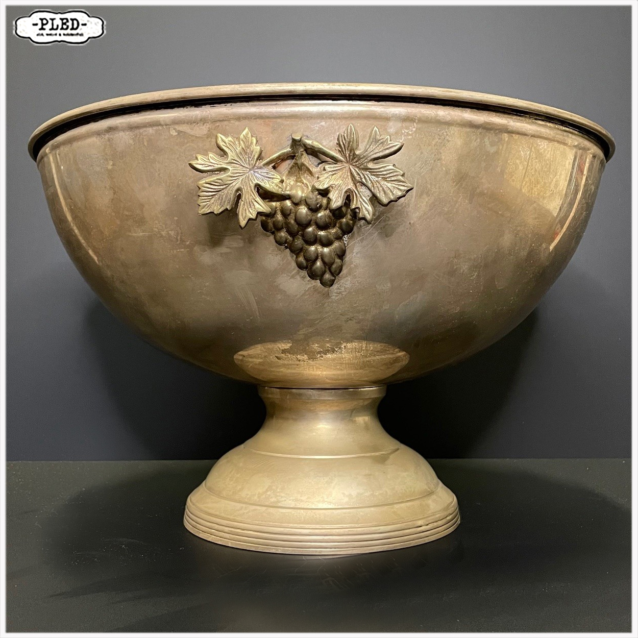 Rijk gedecoreerd met een elegant druiventros-motief, verwijzend naar de herkomst en het gebruik. De schaal rust op een stevige, klassieke voet en heeft een mooi, doorleefd patina, passend bij de leeftijd en het gebruik.