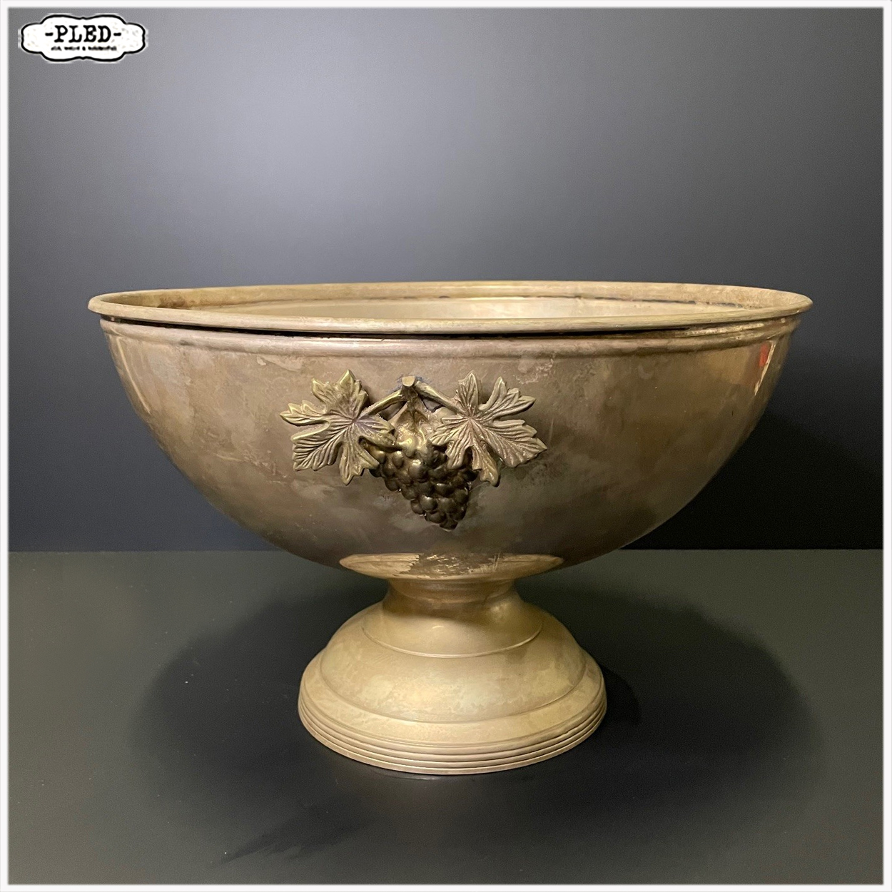 Reich dekoriert mit einem eleganten Traubenmotiv, das auf Herkunft und Verwendungszweck verweist. Die Schale steht auf einem stabilen, klassisch geformten Fuß und weist eine schöne, authentische Patina auf, passend zu Alter und Gebrauch.